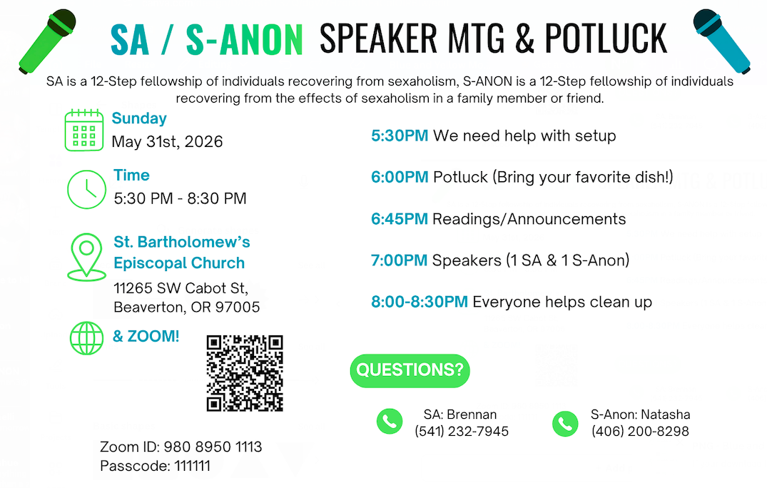 SA-S-Anon Speaker Meeting Potluck is happening Sunday, May 31st from 5:30 to 8:30 pm.